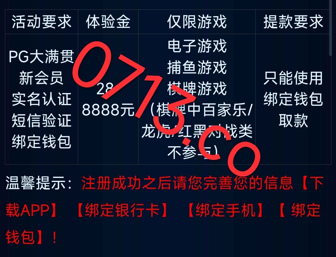 新用户下载app注册绑卡绑定手机号绑定虚拟币钱包 比如okpay/topay 优惠里面自助领取28彩金 限制游玩电子捕鱼棋牌 最低提款100元(只能提现虚拟币钱包)