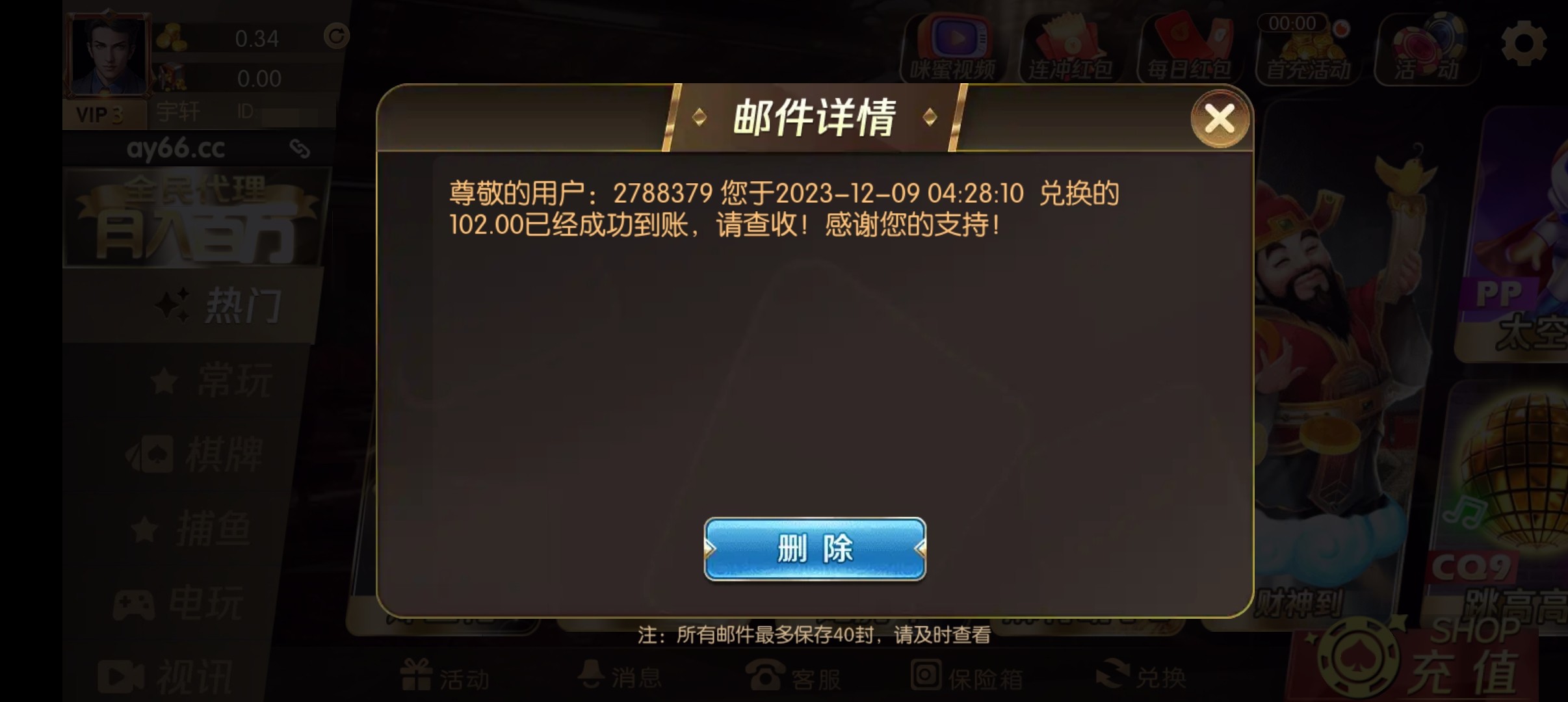 送的38彩金输了然后我充了52上去麻1糊了给288上到300多没要提了一百赚了50