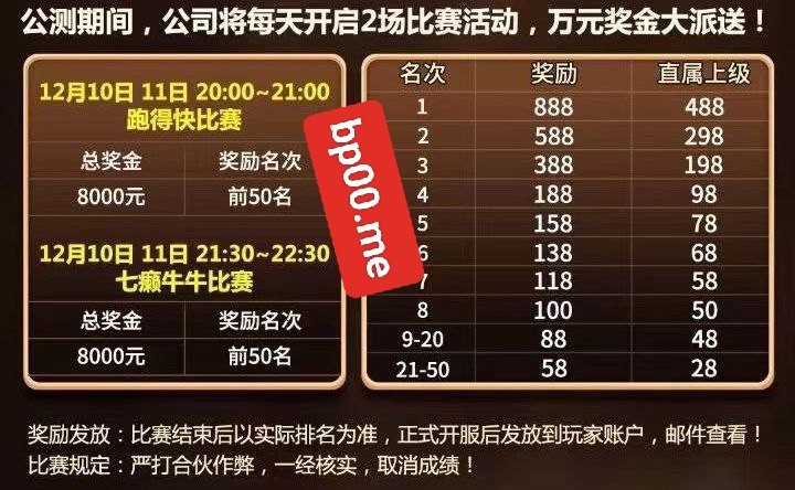 新用户下载app注册 12月10日~12月11日公测期间 每晚点击免费比赛-右上角报名跑得快和七癞牛牛两个比赛 比赛时间今晚8点~9点 9点半~10点半 蹲点参与即可
