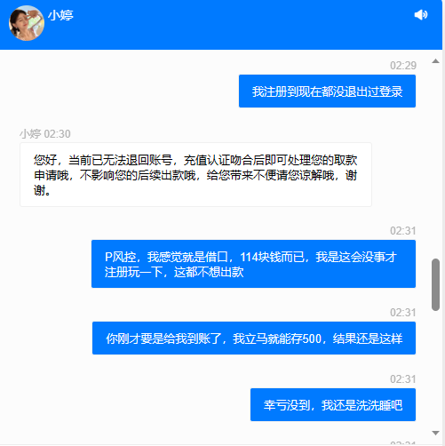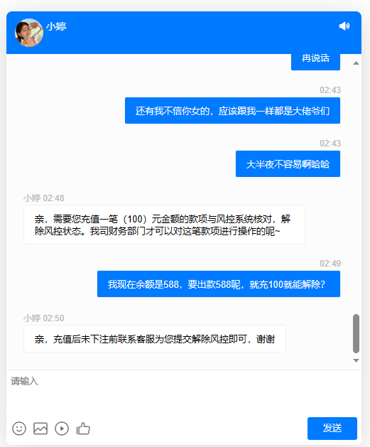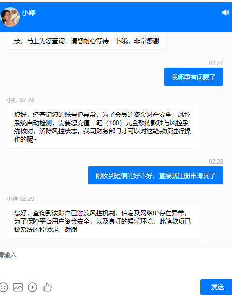 短信特邀我来的,送了10块钱,打到115出款退回来了,客服说IP异常需要再充值一笔100,。下来我玩AG射龙门梭哈了一下,又玩AG电子,一下余额变588了,又问客服,客服又说充100就能解除,敢不敢信?