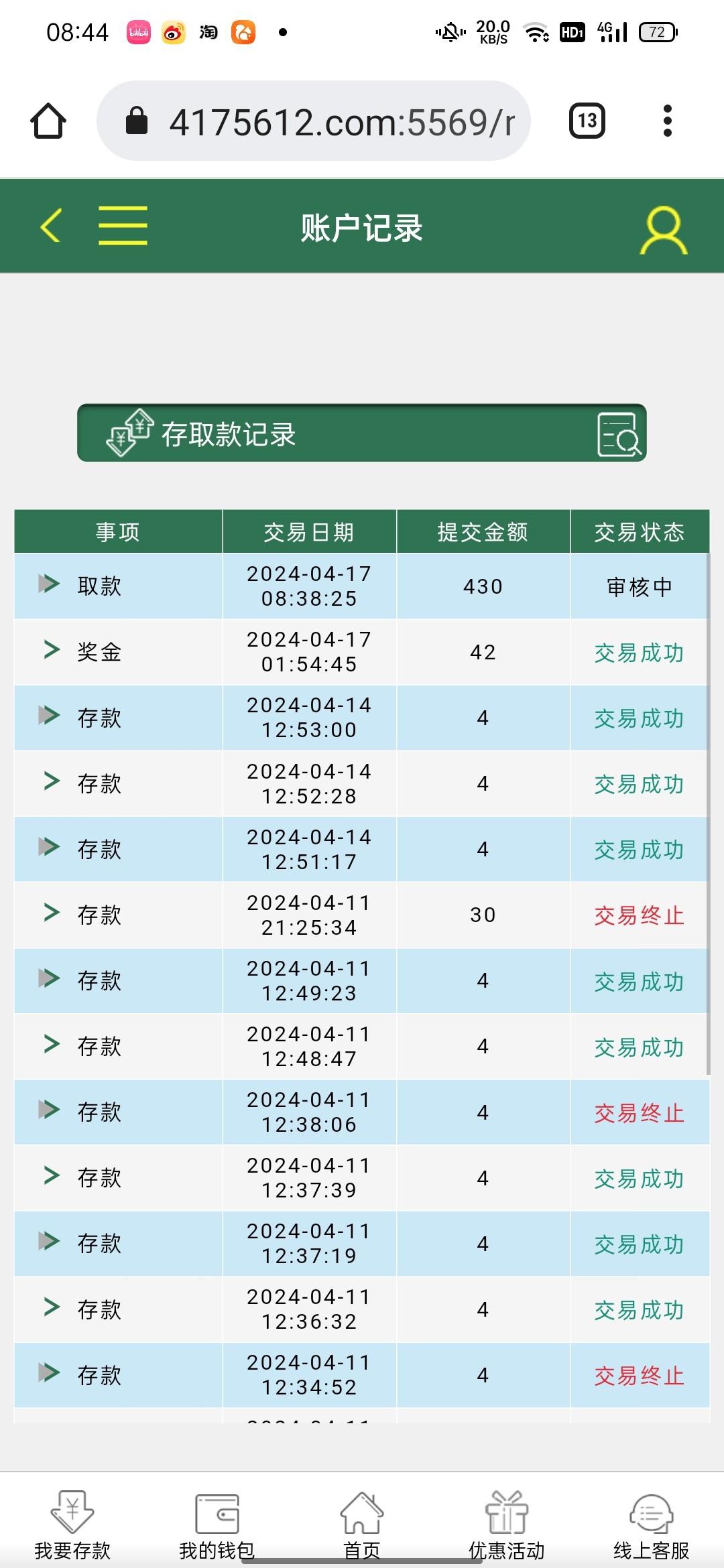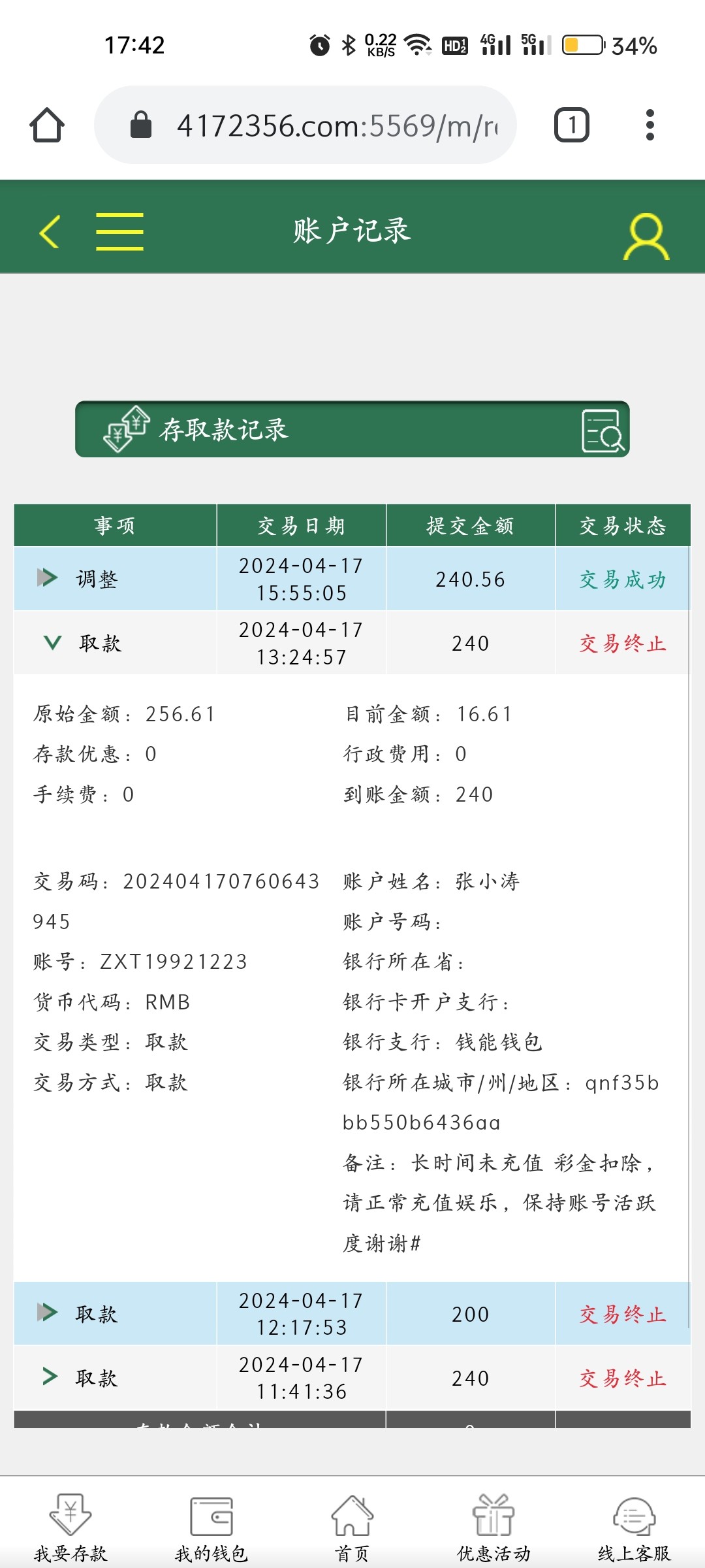 送了24彩金提了240半天不给到账,交易终止