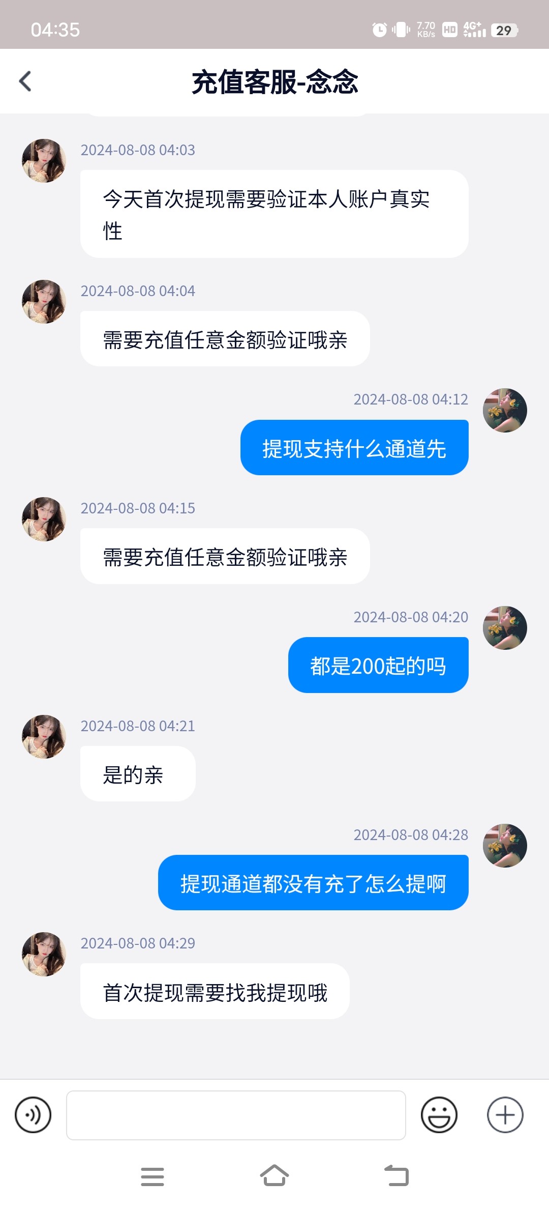 平台就一个客服,变脸特别快。一会是充值客服一会是送茶专员。平台全黑,没有一个能出款的。打上1k,要你先给他转手续费,,套路升级,通道全维护。