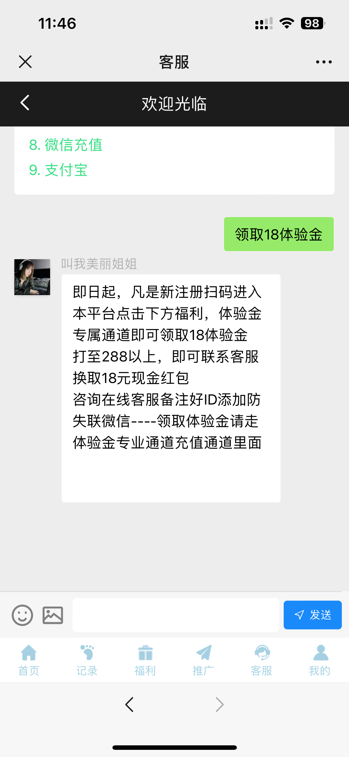 点充值 领取体验金 送18  打到288下18