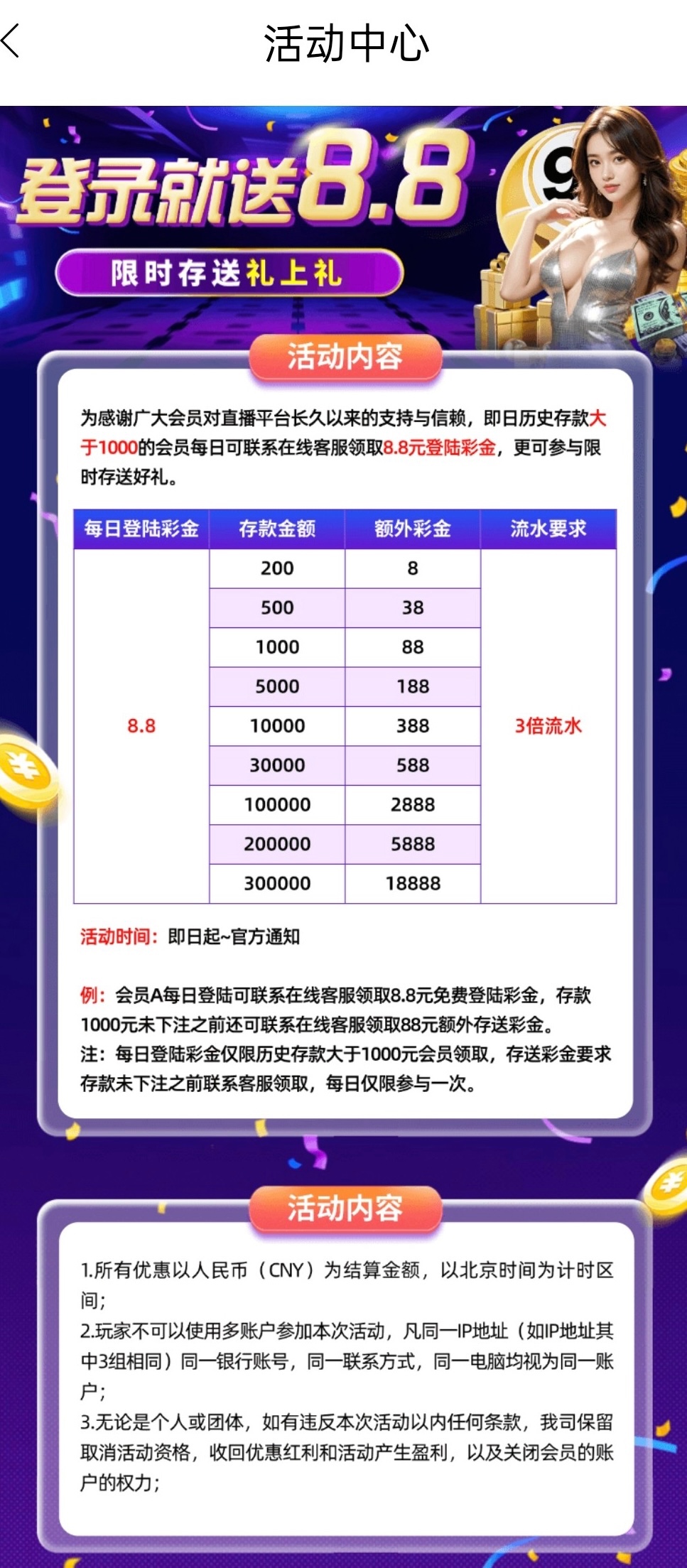 历史存款1000+的,然后每天登录就送8.8