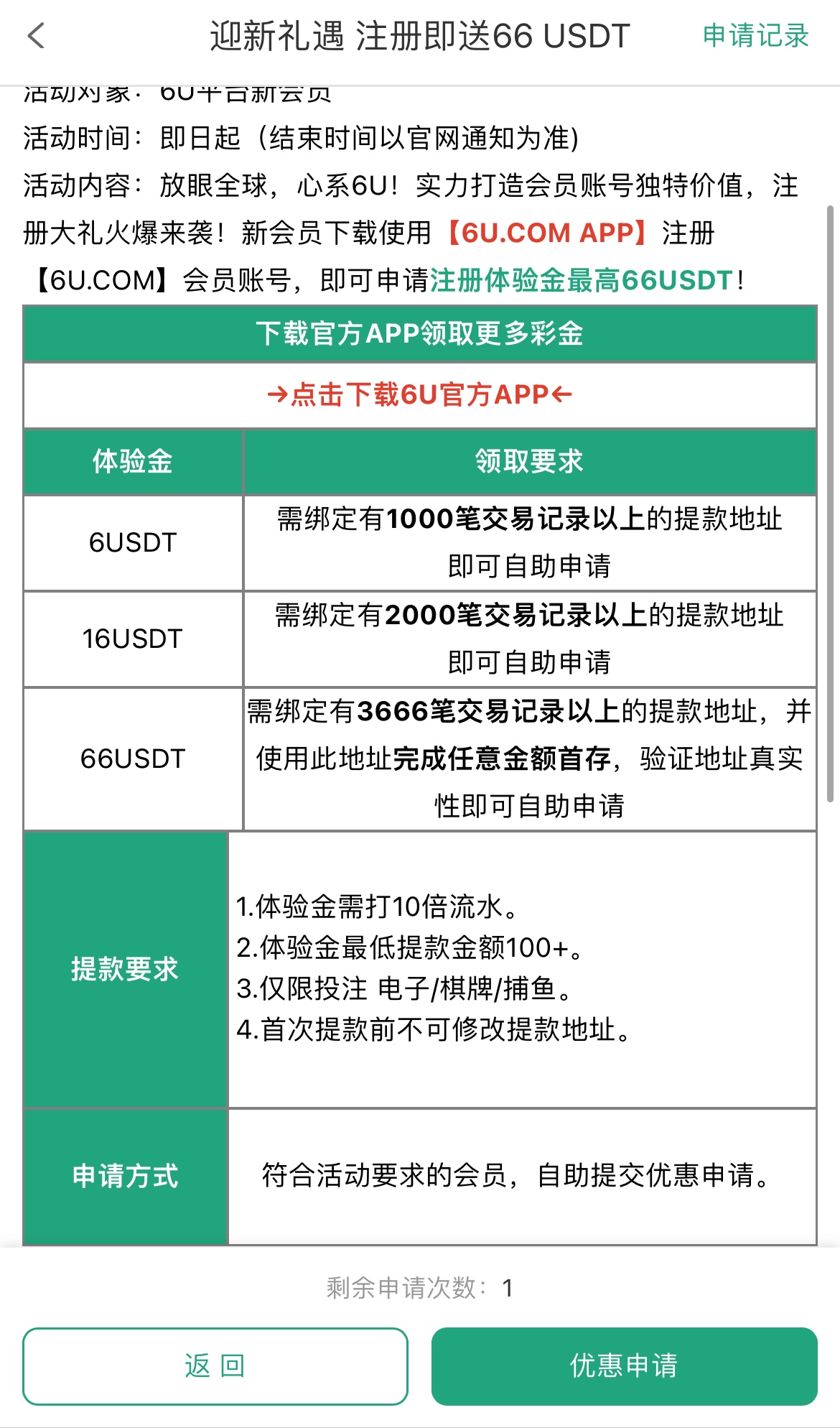 下载APP注册绑定U地址要有1000/2000的交易记录地址就可以自助申请了,彩金10倍流水,最低100提现,限电子棋牌捕鱼
