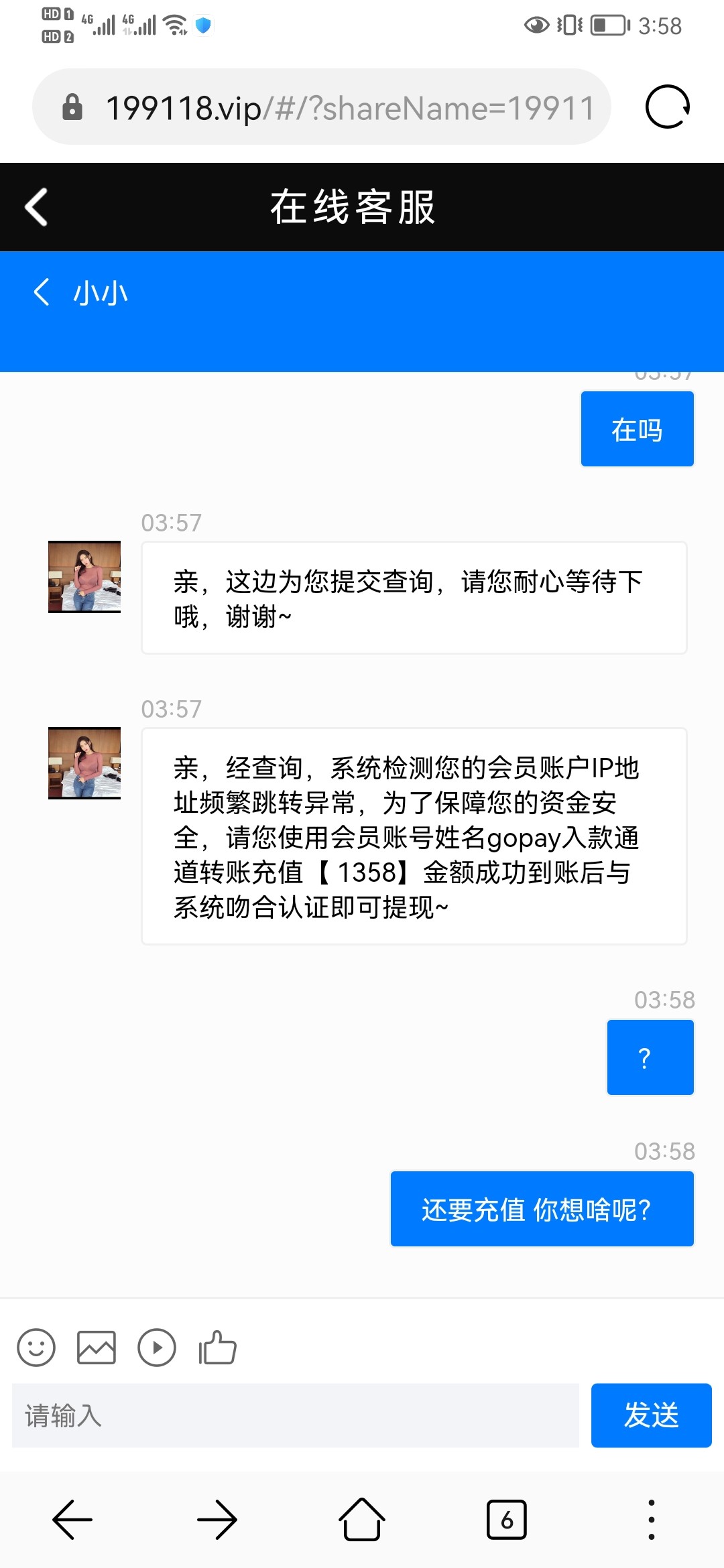 本金600打到1358,提款一直未到账,咨询客服,客服理由ip异常为由要求gopay钱包充值同等金额才能出款!