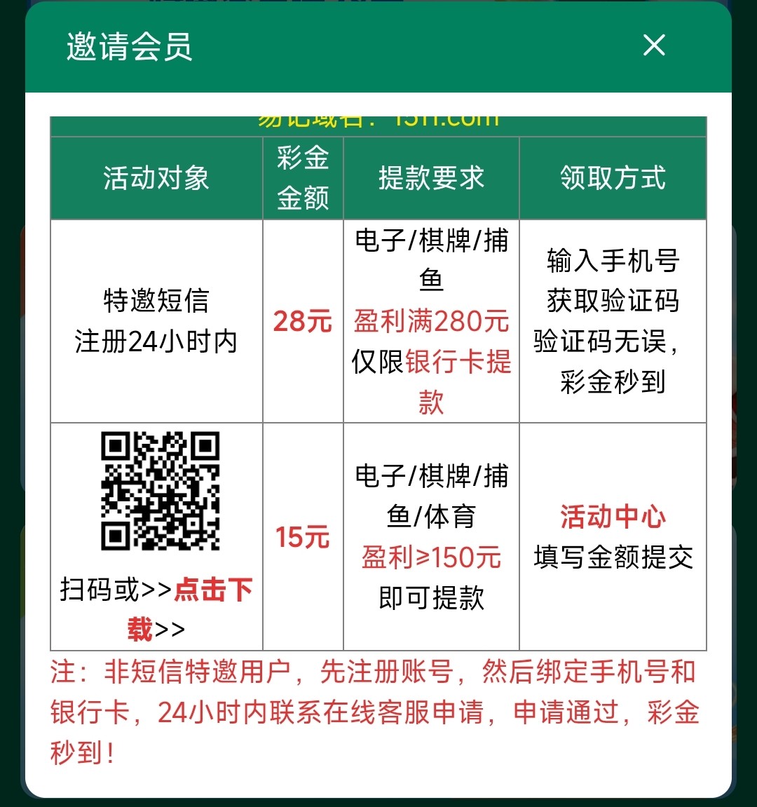 注册好到优惠里找到“特邀会员”在里面输入手机号获取验证码领取彩金,仅限娱乐电子/捕鱼/棋牌,10倍流水,盈利至280以上提款,有账号可以重新注册碰瓷