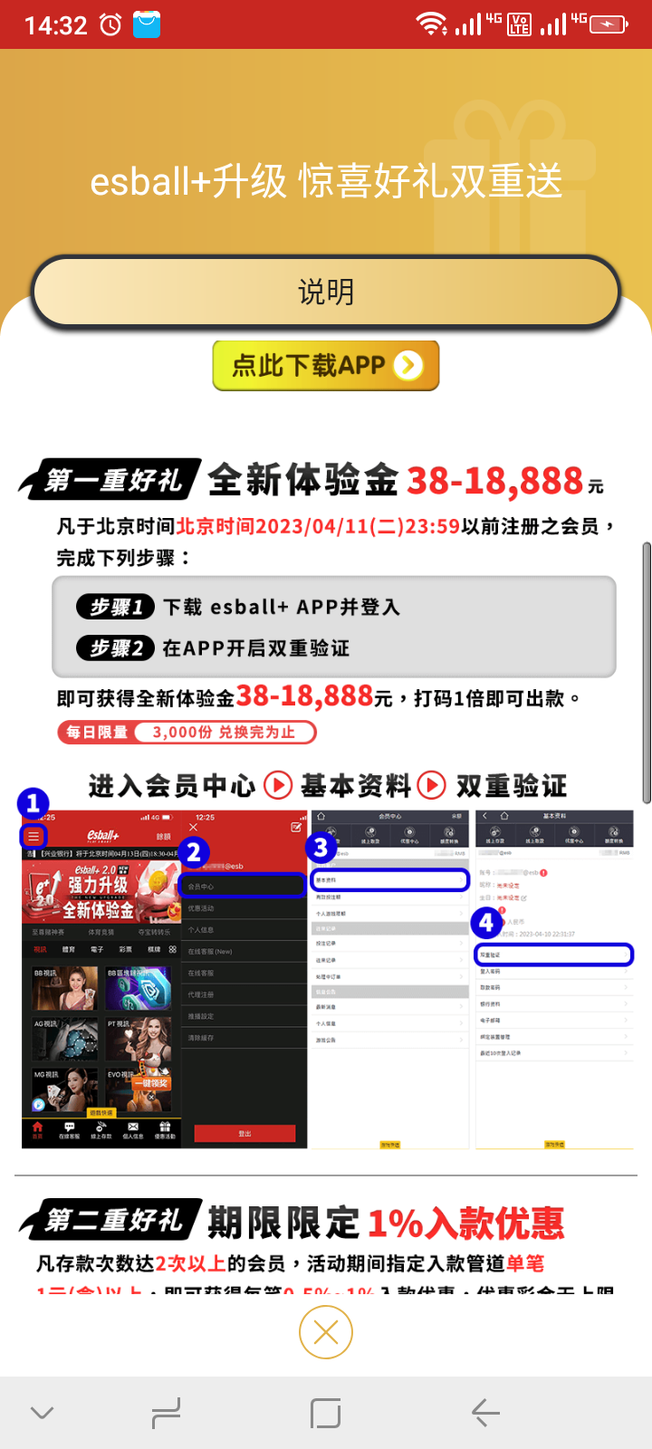 esball老牌公司了,4.11号之前注册的会员,下载APP 设置双重验证即可申请38-18888全新体验金。