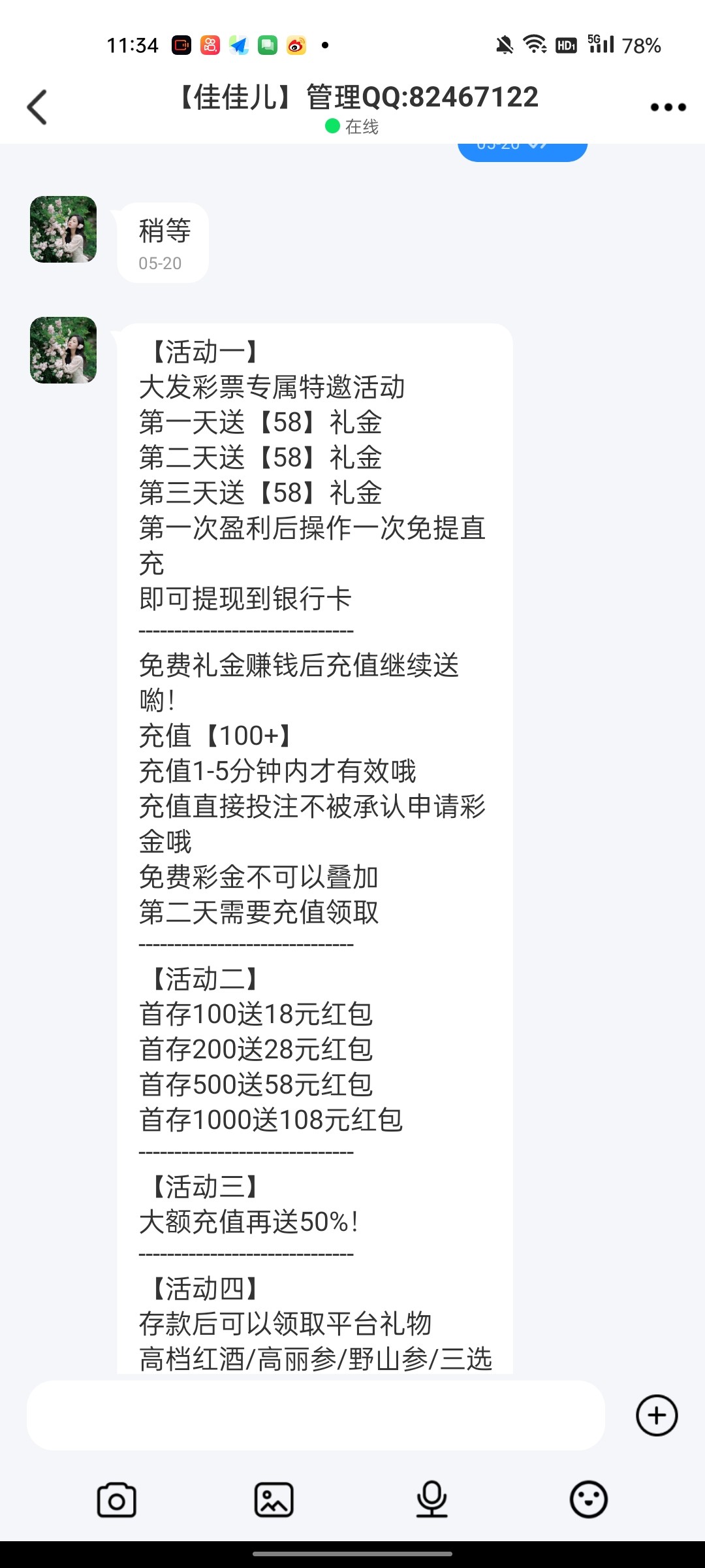 送了五天100 前两天打死了 后面三天 天天出 没叫我充值 因为在第二天的时候我就告诉他我过几天要充值几千 哈哈骗她