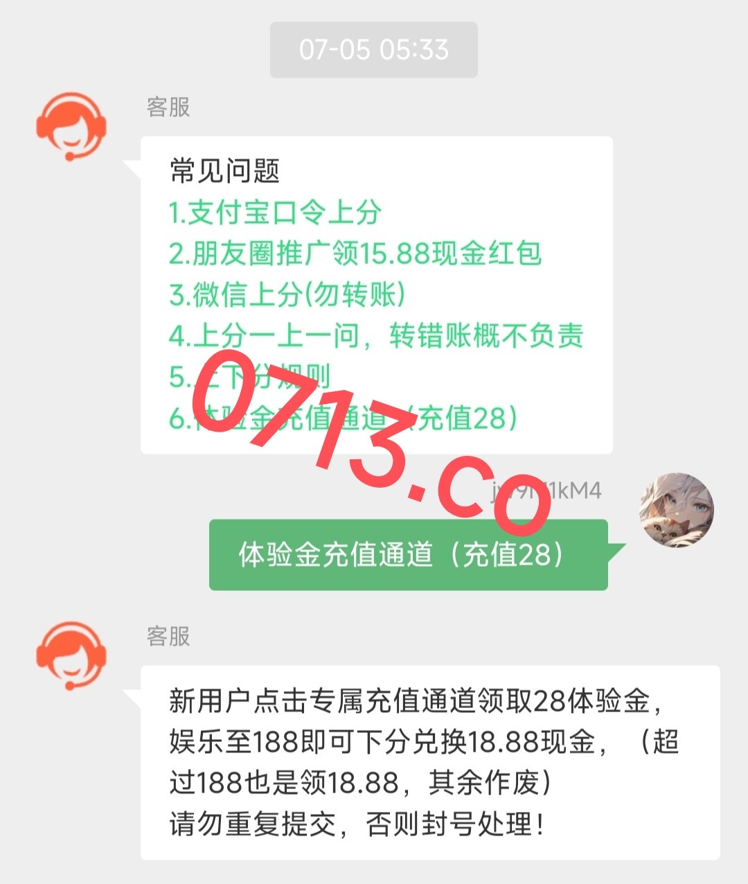新用户微信扫码 充值 体验金通道 自己输入28 提交 打到188 下分18.88 看图吧